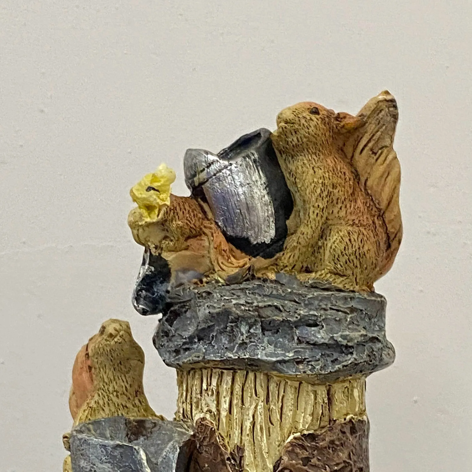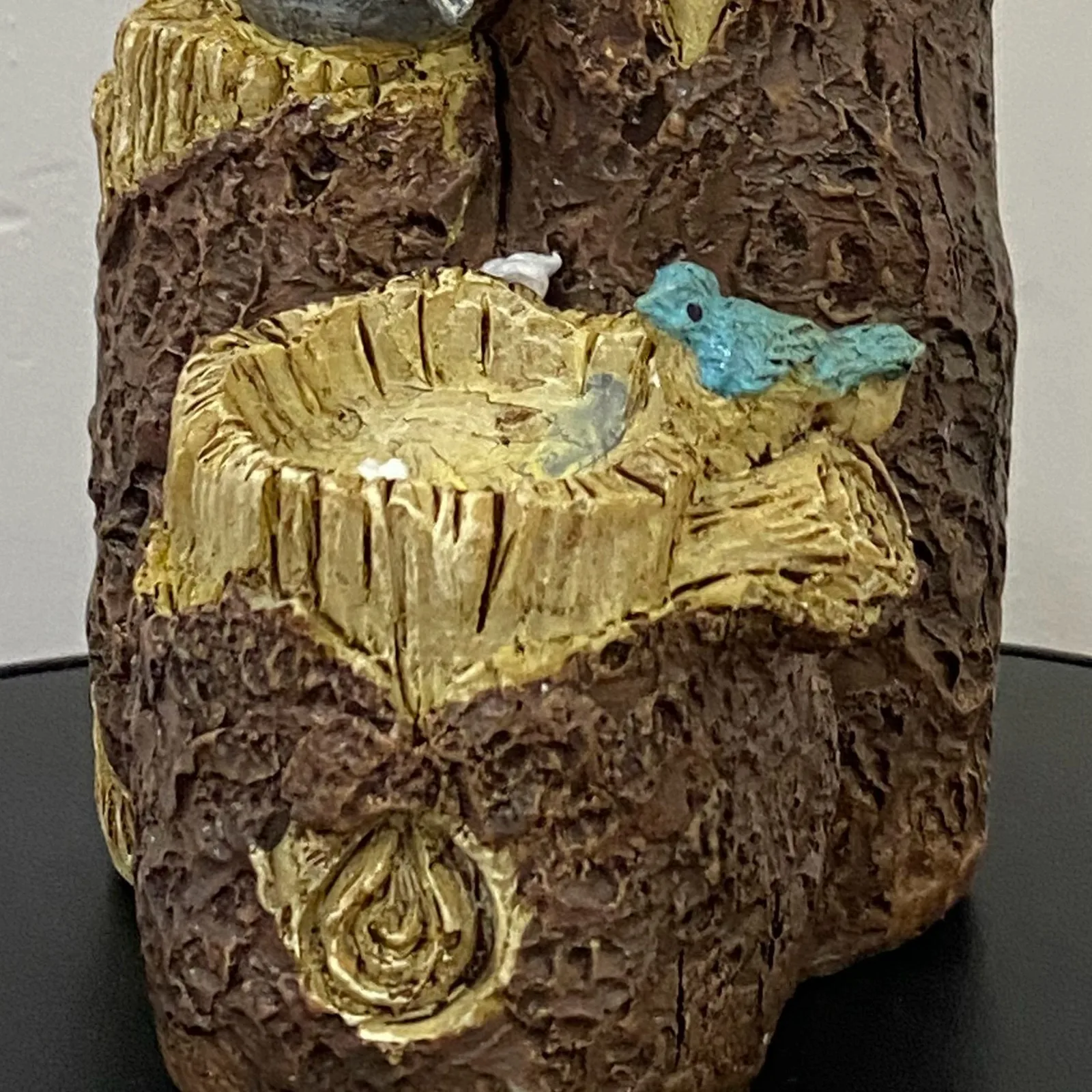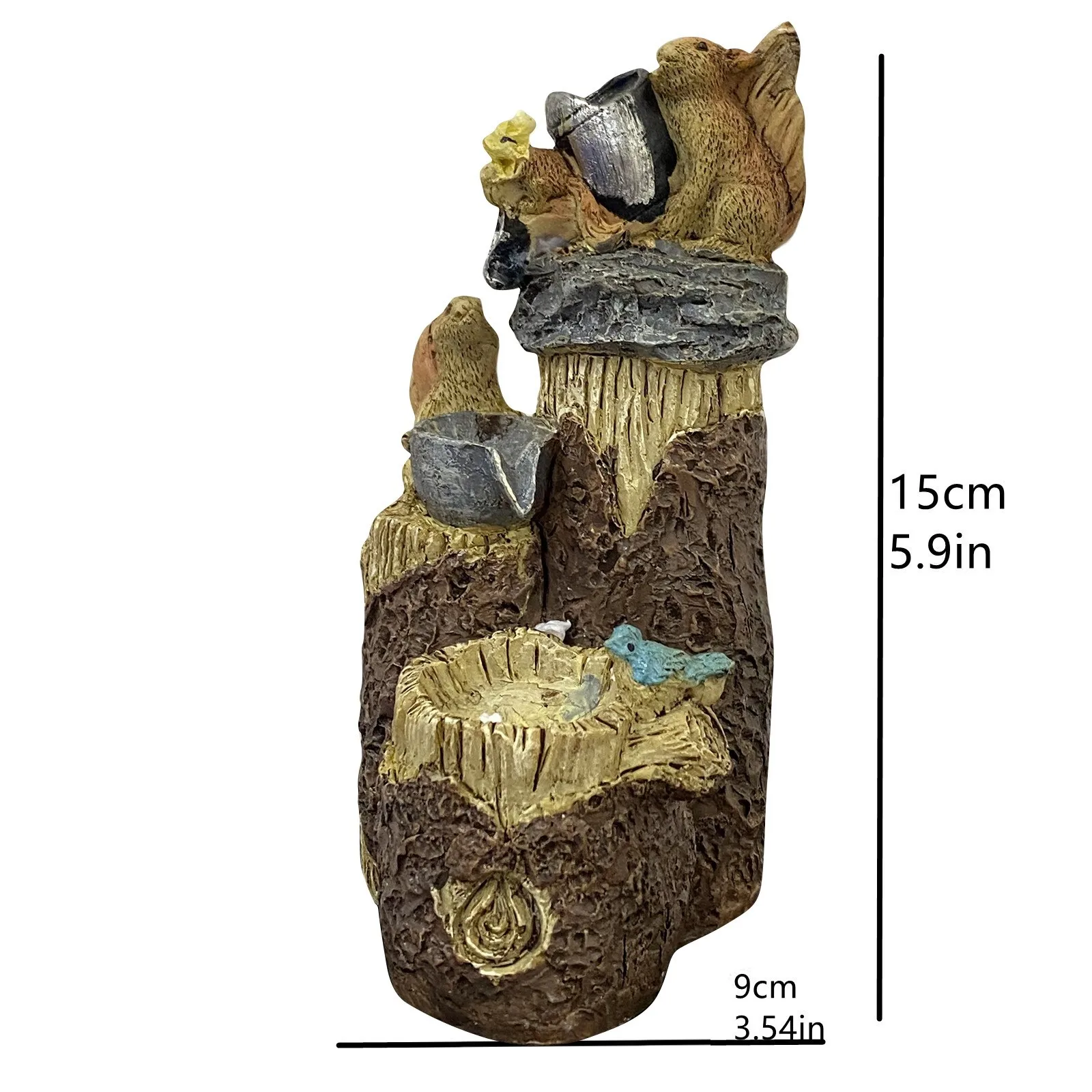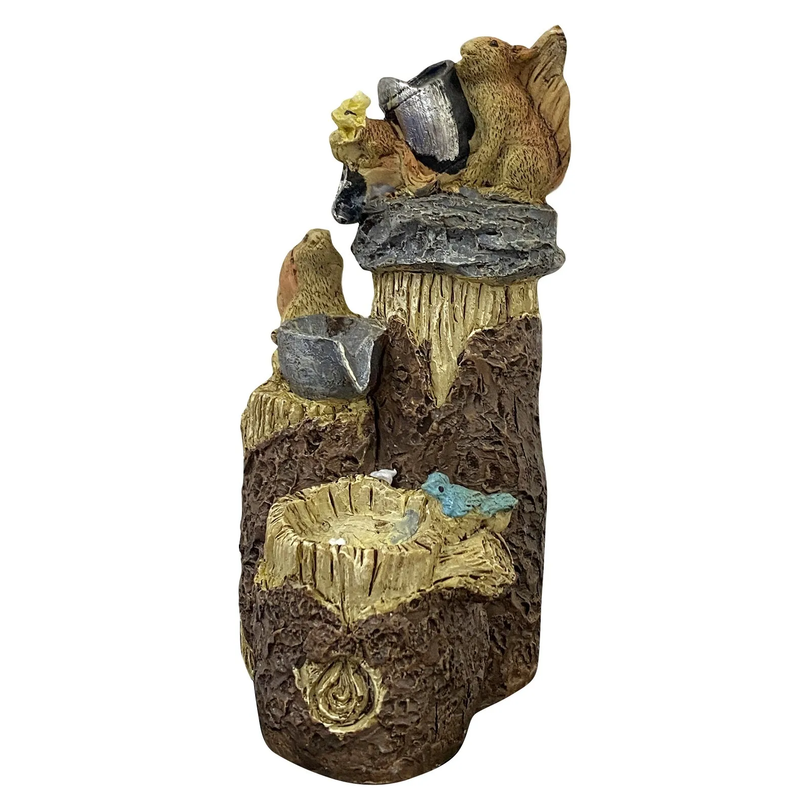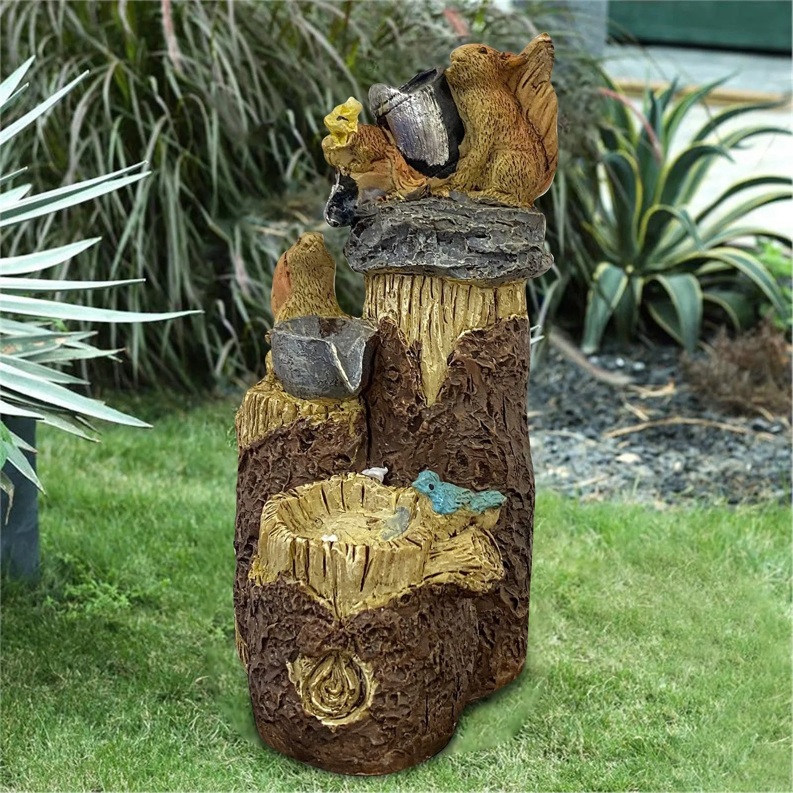 يتميز الفناء بسناجب تسكب الماء على طبقتين إلى جذع الشجرة في الأسفل حيث تنتظر الطائر.