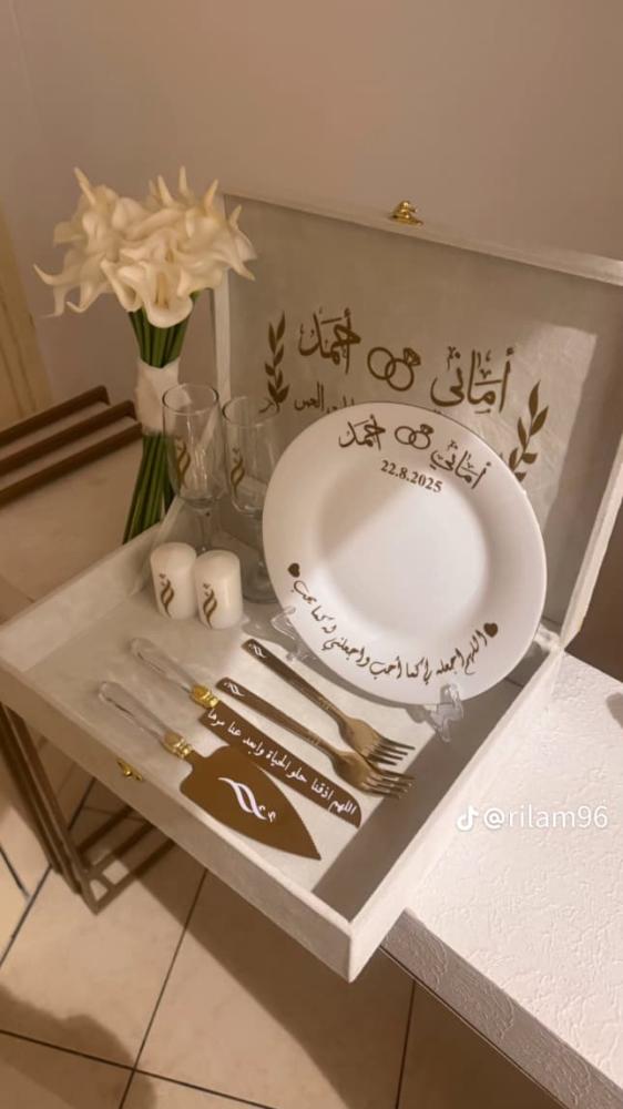 • أدوات المائدة الذهبية: تتضمن شوكتين وسكينًا خاصًا لتناول كعكة الزفاف، مزينة بعبارة "اللهم أذقنا حلو الحياة وأبعد عنا مرها"، تمنحكم تجربة مميزة أي عبارة حسب الطلب.