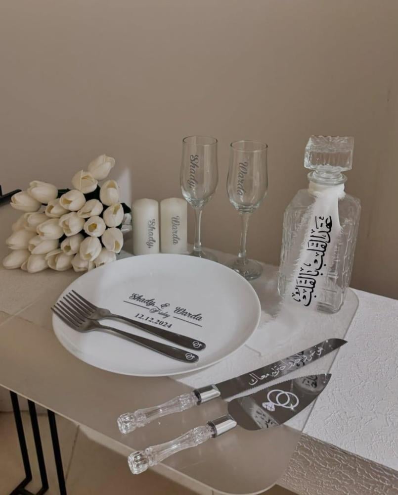- أدوات المائدة الذهبية: تتضمن شوكتين وسكينًا خاصًا لتناول كعكة الزفاف، مزينة بعبارة "اللهم أذقنا حلو الحياة وأبعد عنا مرها"، تمنحكم تجربة مميزة أي عبارة حسب الطلب.
